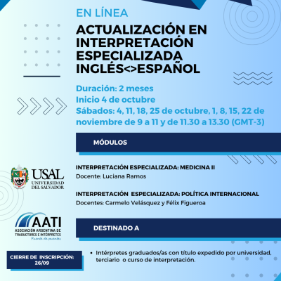 Capacitación 25-08-25 Por AATI Actualización en Interpretación Especializada inglés <> español AATI-USAL Por AATI ¡Atención intérpretes de inglés! Ya está abierta la inscripción. Descarga el programa aquí. Información sobre los aranceles aquí.