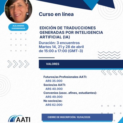 Alejandra Karamanian te invita a profundizar en la aplicación de LQA y la adaptación de textos generados por distintos motores de traducción automática. Si querés incorporar herramientas para ampliar tus servicios o animarte a aceptar ese encargo que venís postergando, no te podés perder esta propuesta. Aprovechá abril para sumar más práctica profesional.