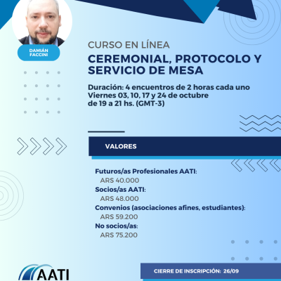 No socios: $75200 Socios AATI: $48000 Programa AATI Futuros Profesionales: $40000 Socios/as FAT, FIT LatAm, Red Vértice, AAILS, ACN, UBA, ACOTIP, Asociación Creando Nexos y PLECA: $59200 Estudiantes: $59200