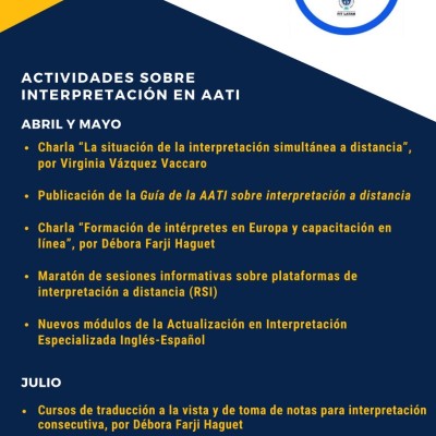 Interpretación 06-07-20 Por AATI Actividades sobre Interpretación en AATI - 2020 Por AATI Presentamos la lista de actividades sobre interpretación que se realizaron este año en nuestra asociación.
